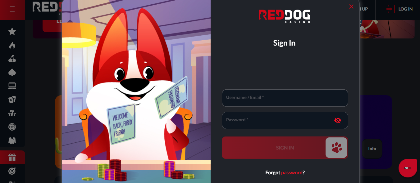 - Log in – on the homepage, click the Red Dog casino login button and enter the username and password you created when you registered.