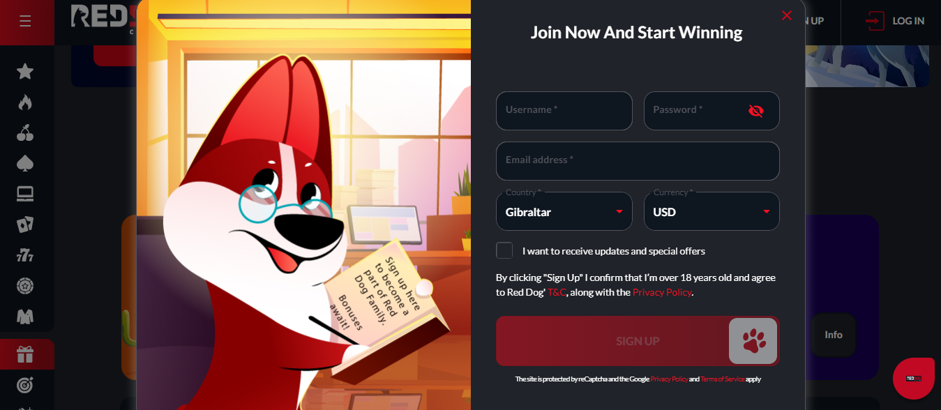 - Click the signup button – on the home page of the site, look for the “Register” or Red Dog casino sign up button.